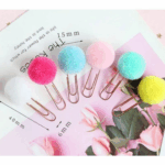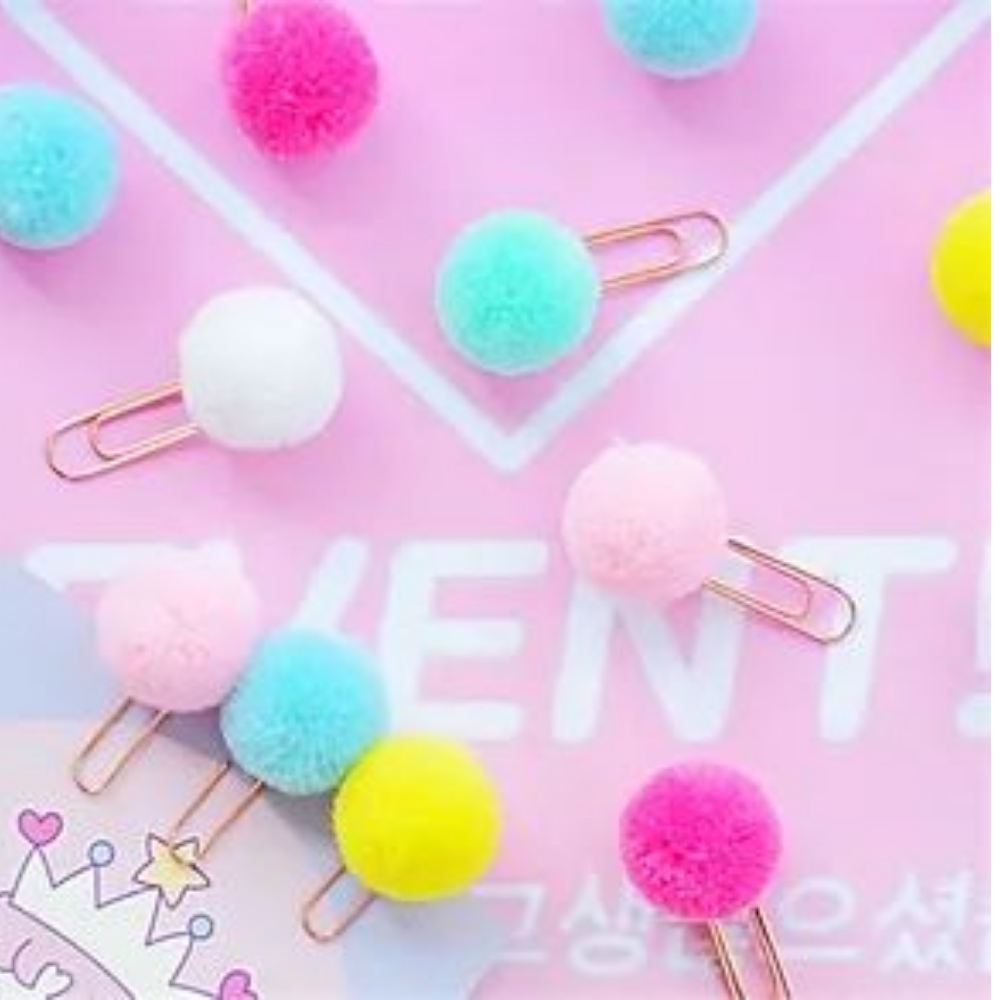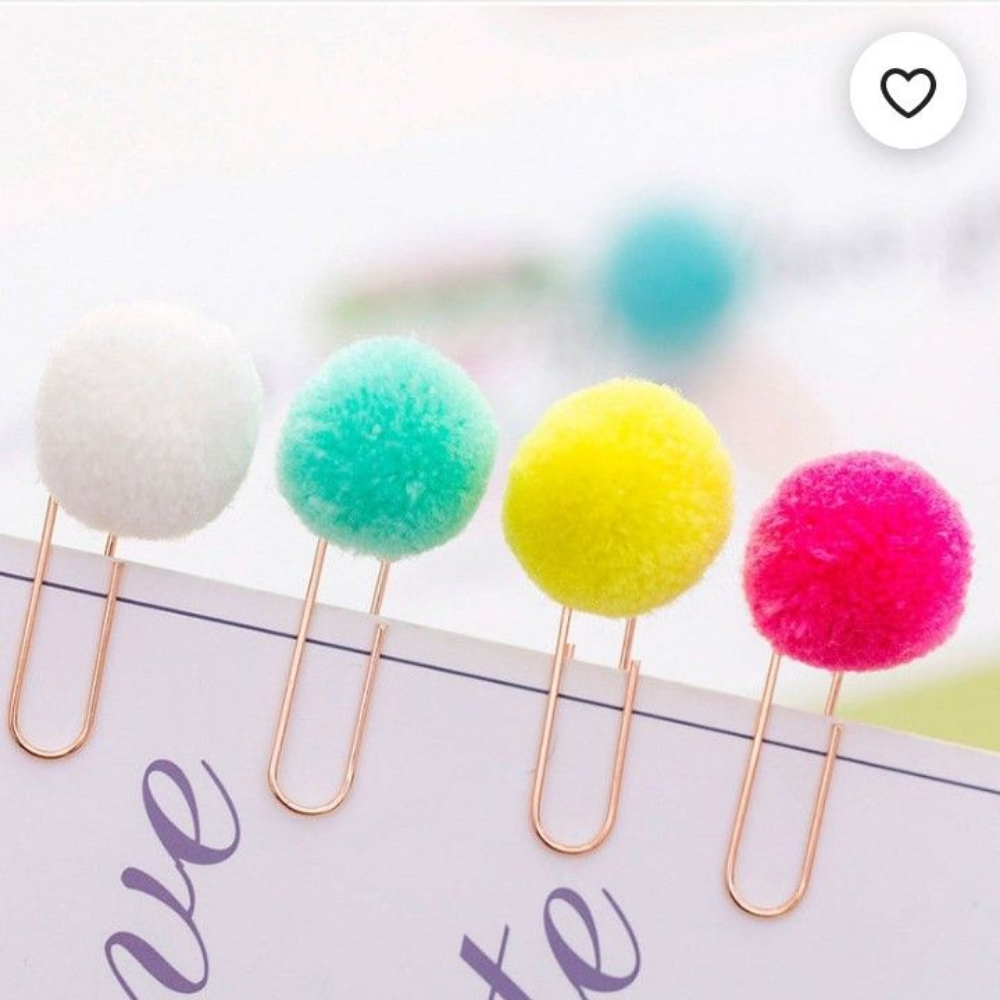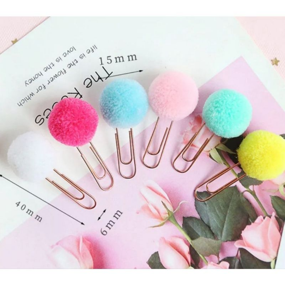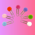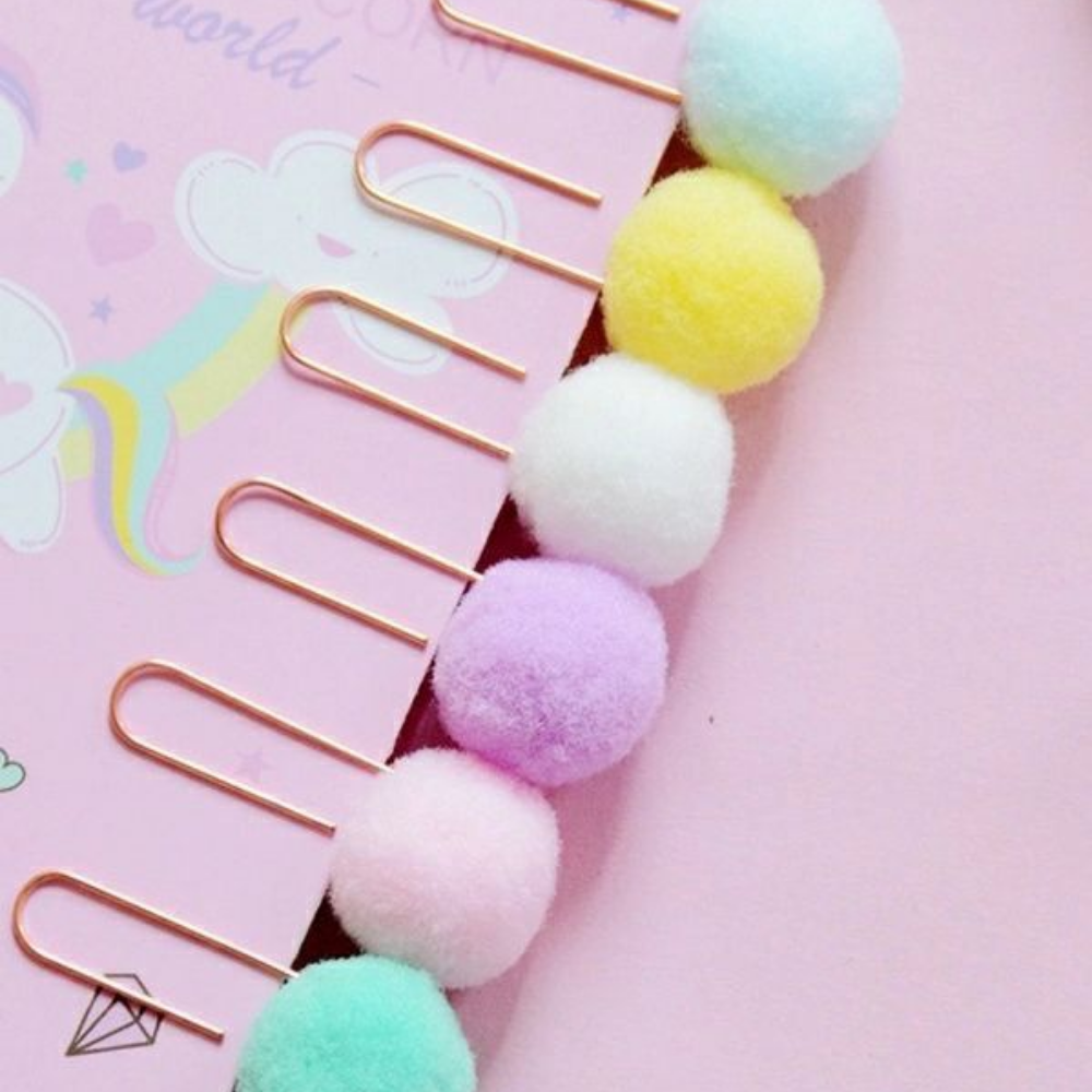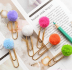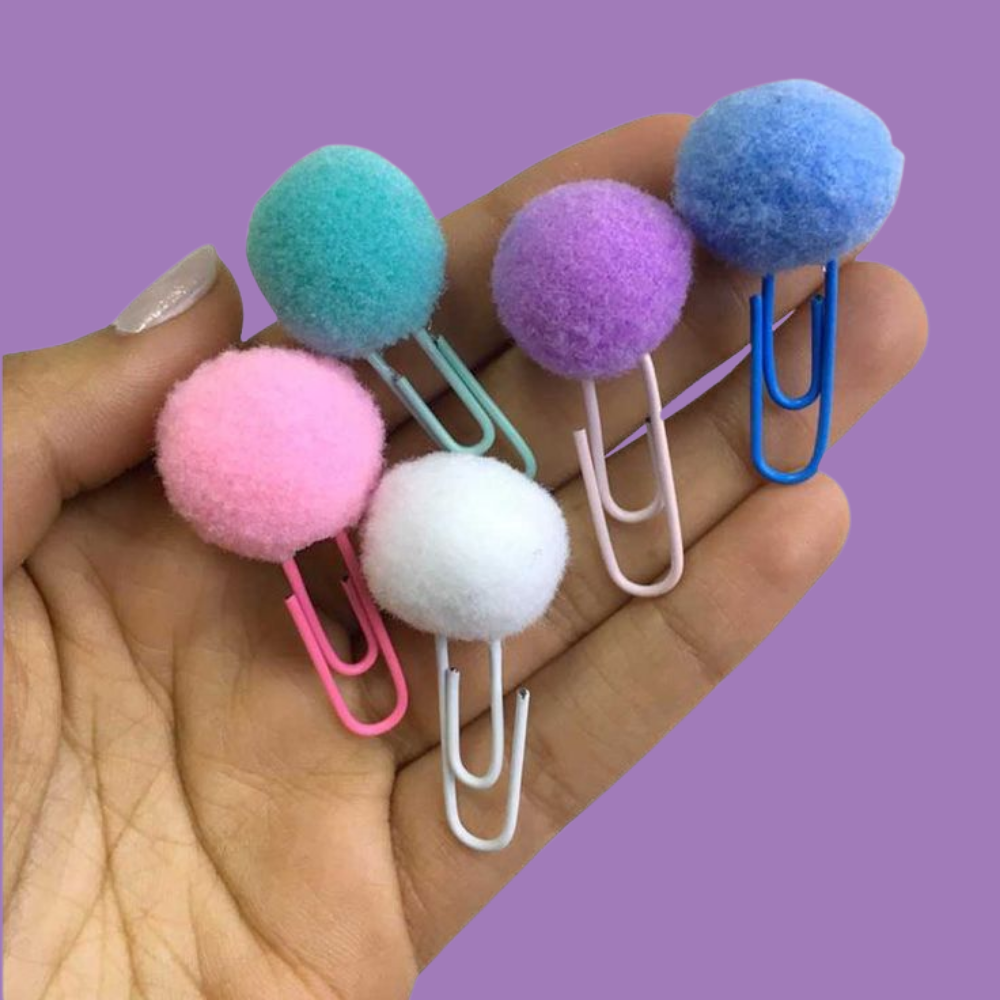 Feitos com clips metálicos coloridos e um pompon de lã macio, são ideais para marcar páginas, organizar papéis ou decorar planners e agendas.