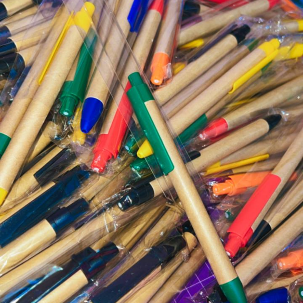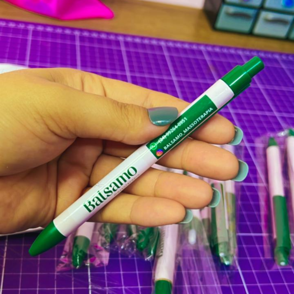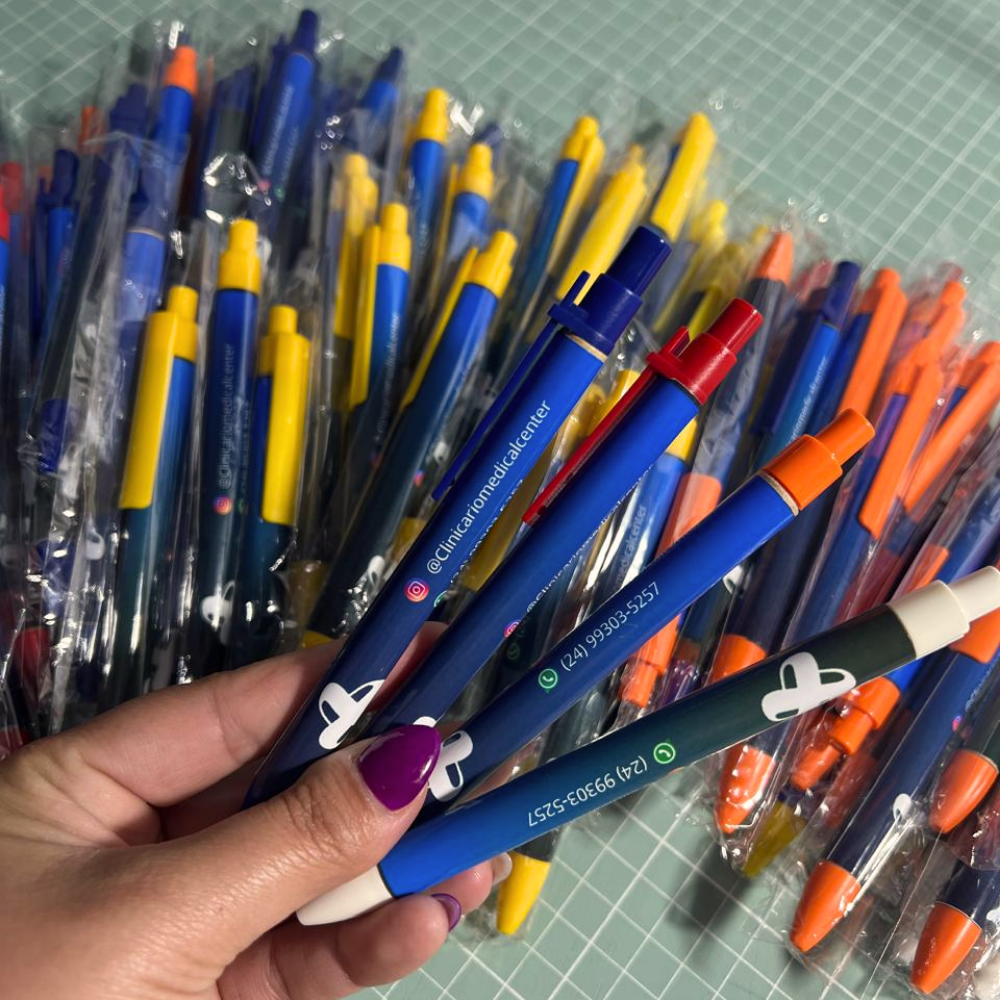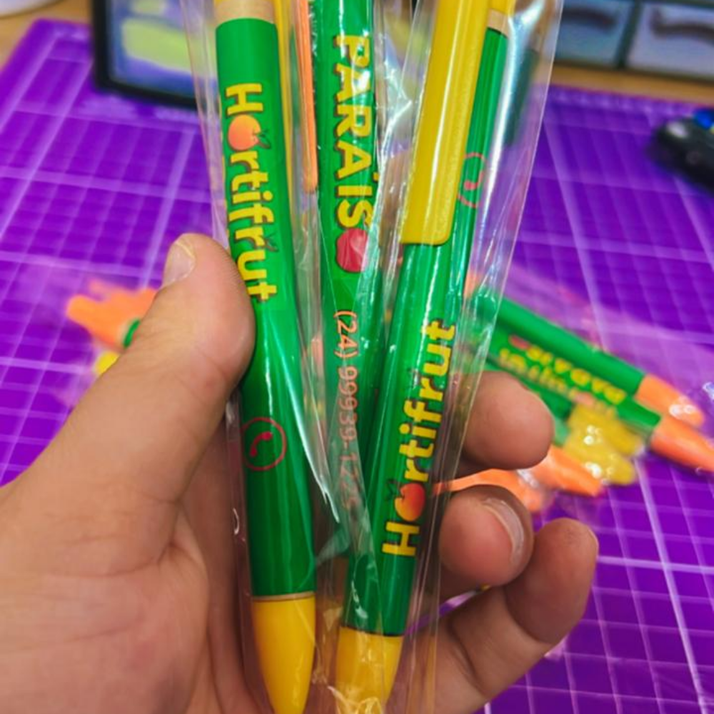 Feitas com corpo ecológico e acabamentos coloridos, essas canetas são ideais para eventos, brindes corporativos, lembrancinhas e uso no dia a dia.